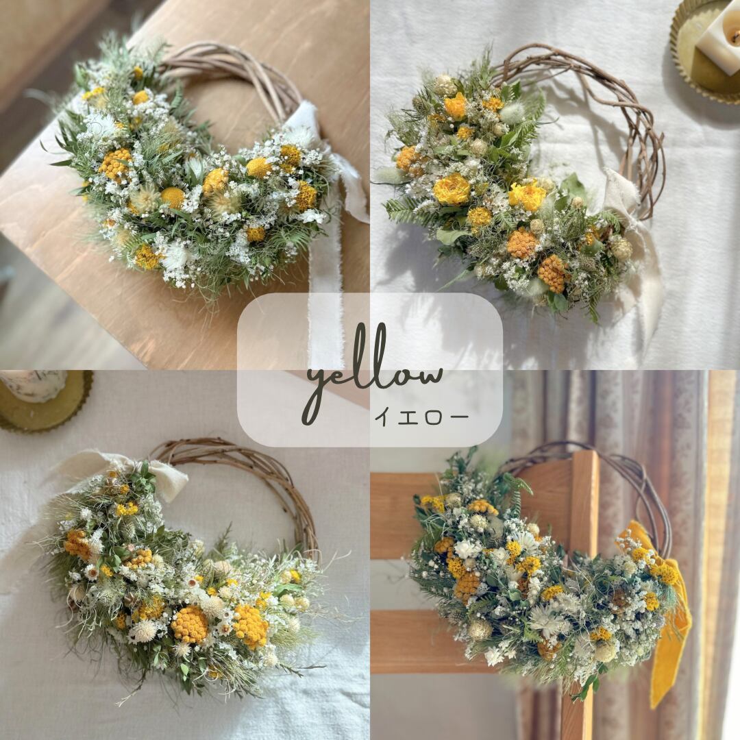 こちらの商品は受注生産品です。ご注文をいただいてから、その時に色・形が綺麗な状態のドライフラワーを使い、蔓で編んだリースに結びつけて制作します。