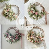 こちらの商品は受注生産品です。ご注文をいただいてから、その時に色・形が綺麗な状態のドライフラワーを使い、蔓で編んだリースに結びつけて制作します。